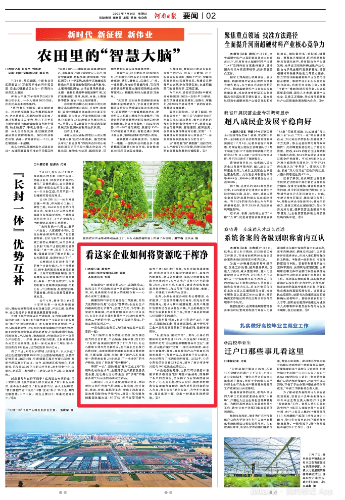 7月10日,圍繞樓陽生書記指示精神,《河南日?qǐng)?bào)》再次以《看這家企業(yè)如何將資源吃干榨凈》為題,以豐富的案例對(duì)心連心集團(tuán)落實(shí)高質(zhì)量發(fā)展理念,加大對(duì)科技創(chuàng)新的投入力度,努力實(shí)現(xiàn)“肥化雙強(qiáng)”的經(jīng)驗(yàn)做法進(jìn)行了延伸報(bào)道。